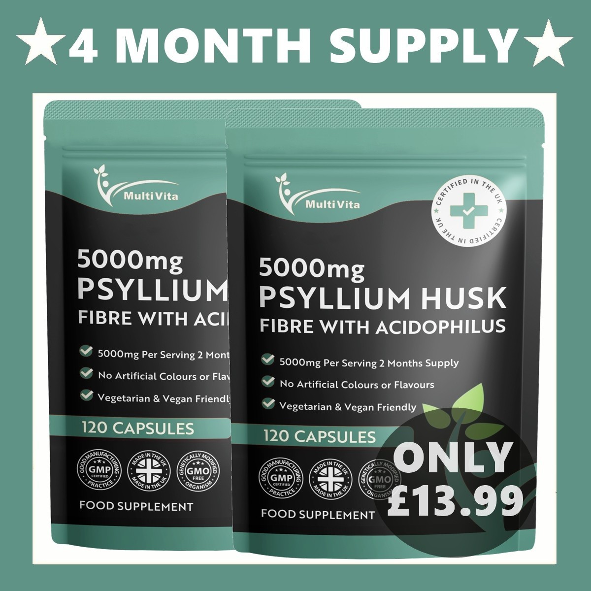 Psyllium Husk Capsules Fibre Supplement With Probiotic Acidophilus 4000mg Vegan