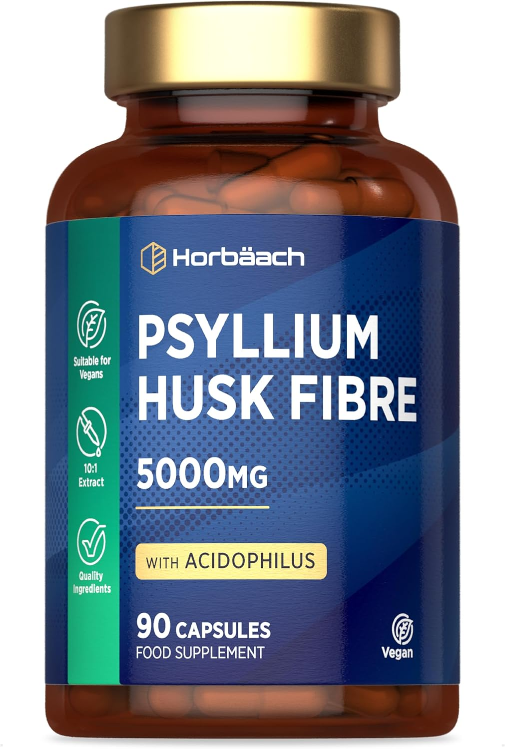 Psyllium Husk Capsules 5000mg with Acidophilus | Natural Soluble Fibre Supplement with ProBio | Plantago Ovata Seed Husk Extract | 90 Vegan Capsules | by Horbaach
