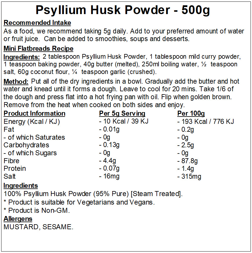 Psyllium Husk Powder 100% PURE Fine Milled Easy To Blend Soluble Fibre 500g NEW