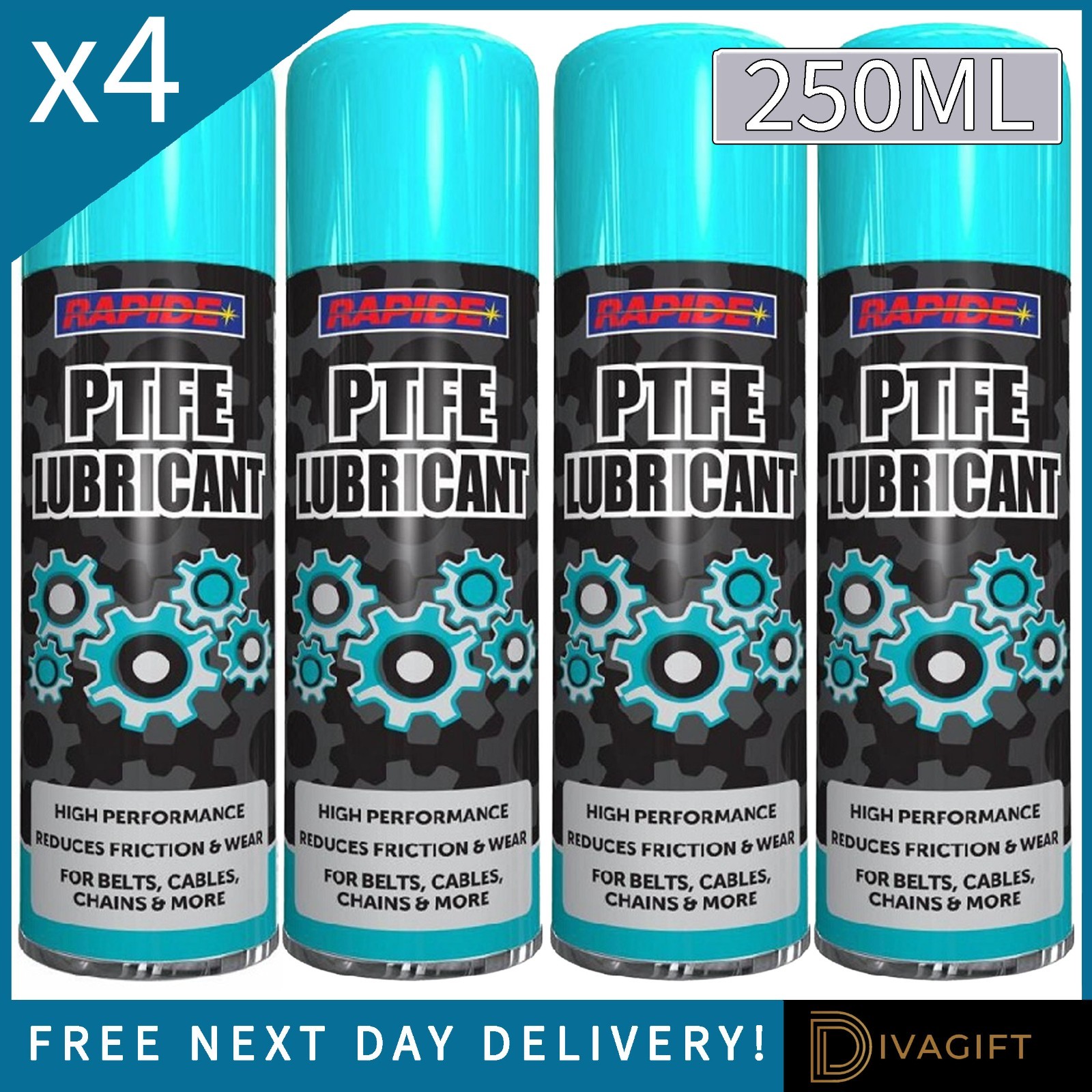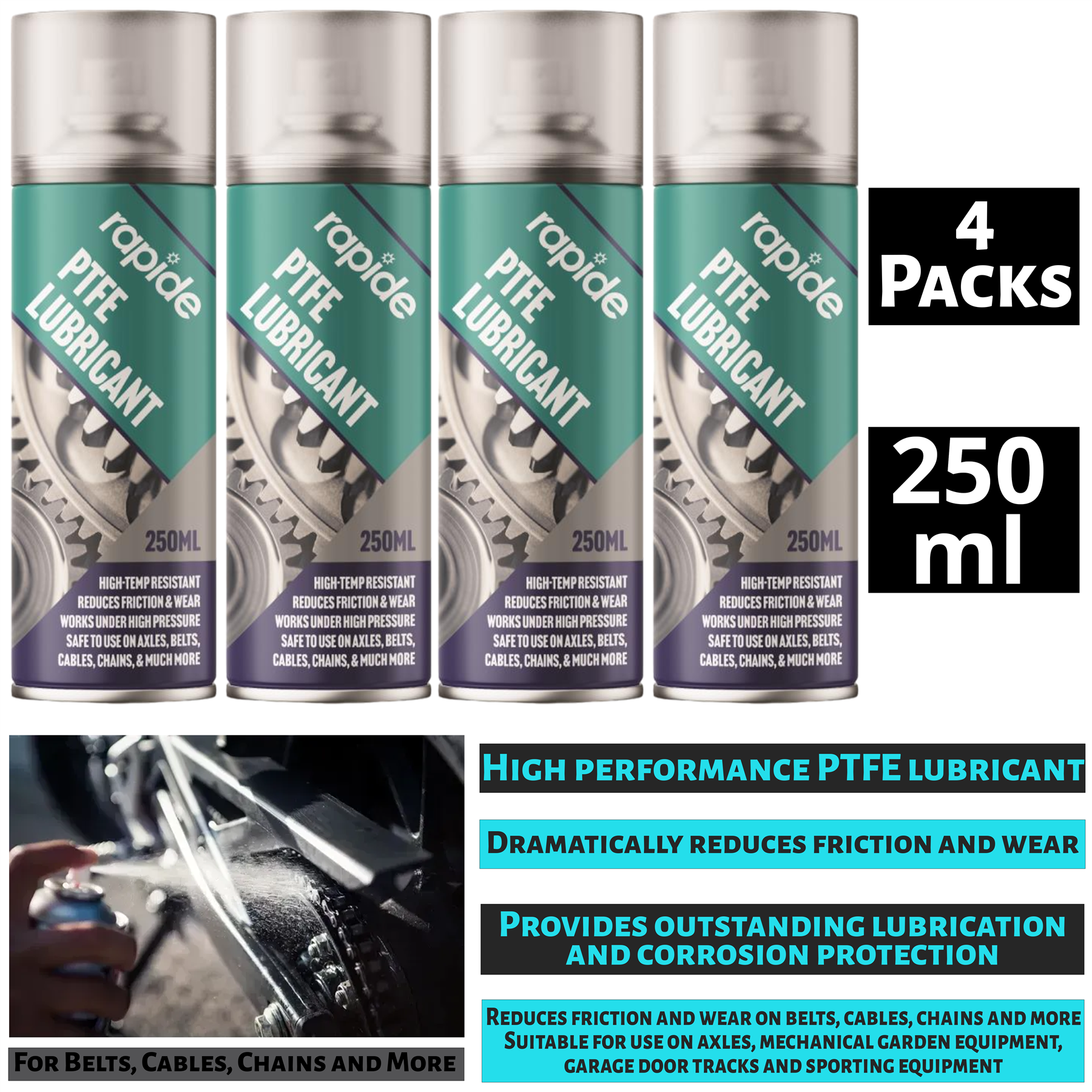 4 x PTFE GREASE AEROSOL LUBRICANT SPRAY 250ML CAN CHAINS BELTS CABLES OIL NEW