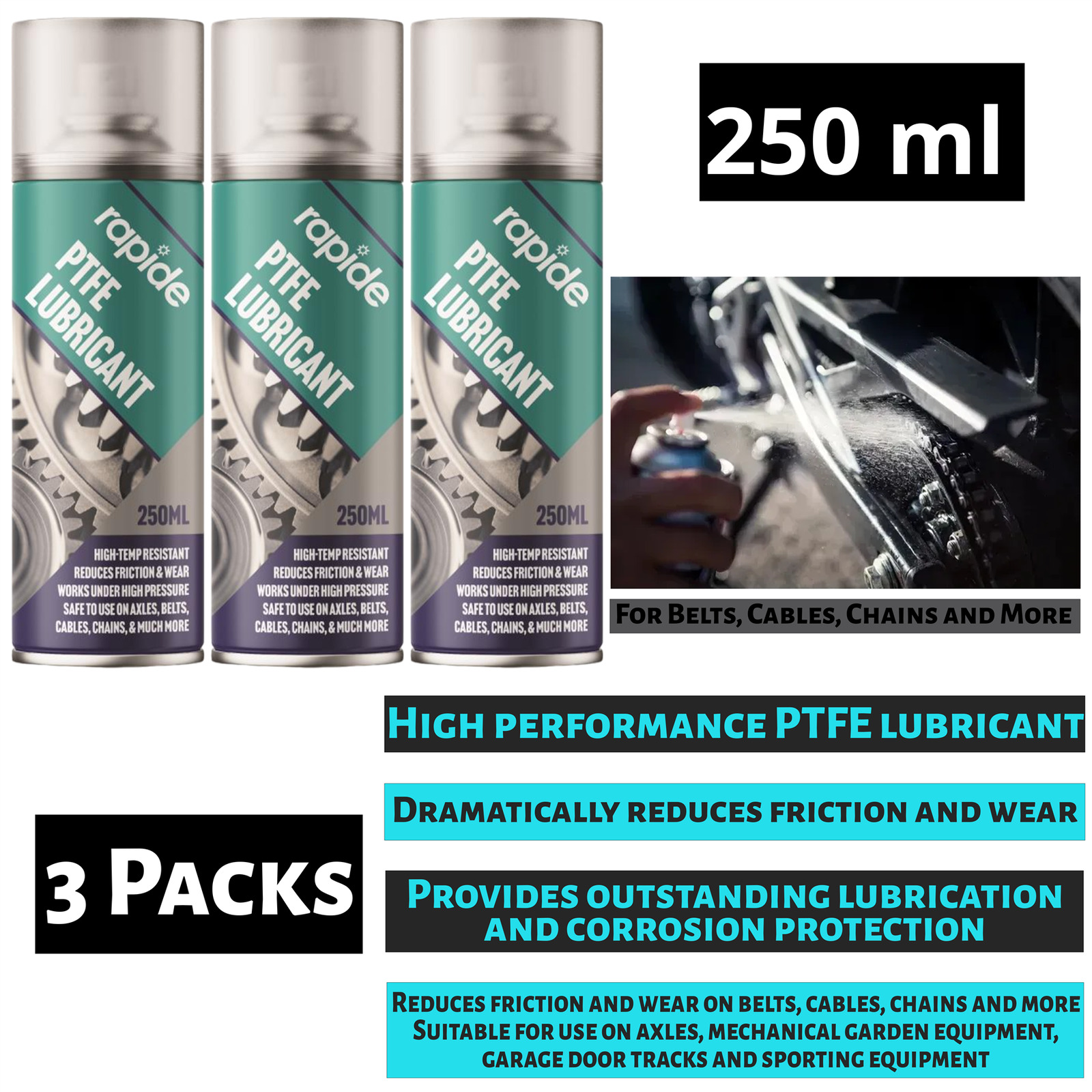 3X PTFE Grease Aerosol Lubricant Spray Can Chains Belts Cables Oil 250ml