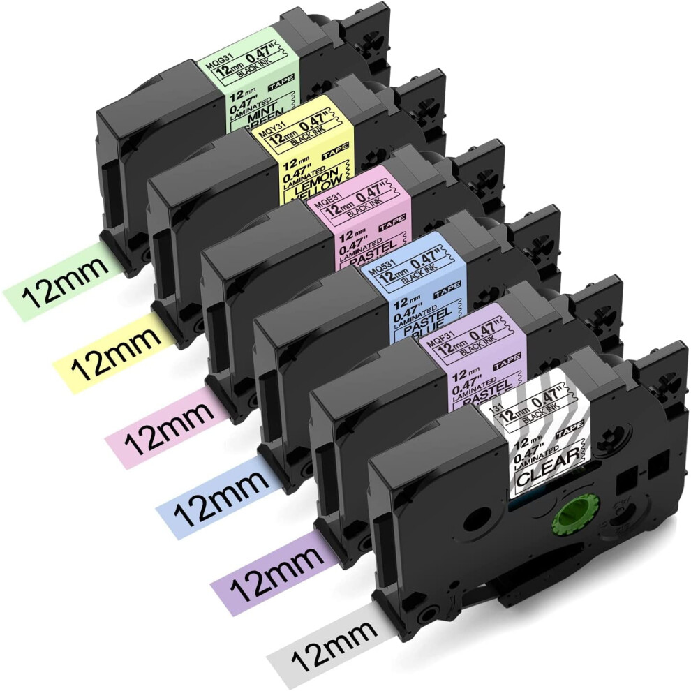 Ptouch Tape 12mm 0.47 Inch Laminated Clear/Purple/Blue/Pink/Lemon Yellow/Mint Green Replacement for Brother TZe Tape