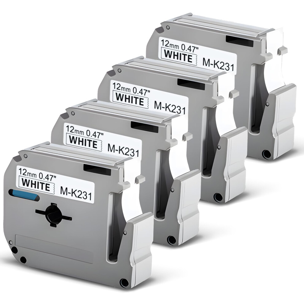 12mm Black on White Label Tape, Durable Adhesive, Easy Peel, 4 Pack Compatible with Brother Ptouch MK231 for PTM95 PT90 PT85 PT70BM PT65