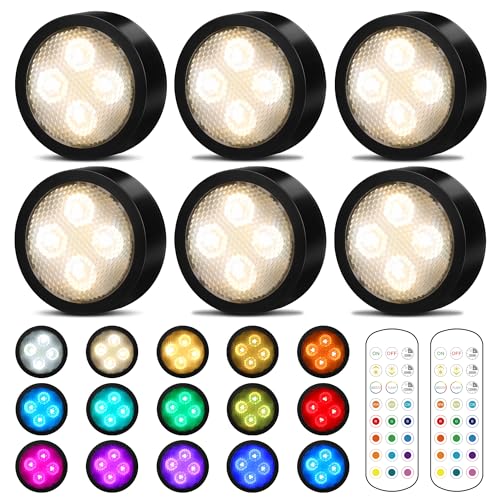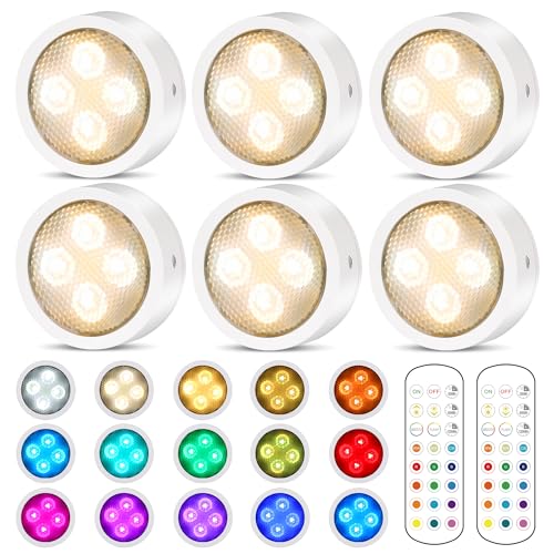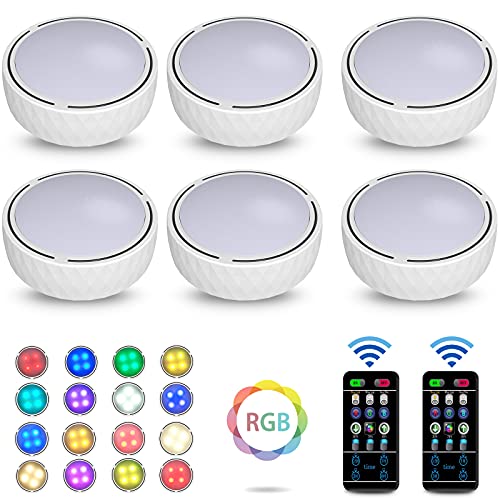 Bawoo Under Cabinet Lights, RGBW Wireless LED Puck Lights Remote Control,3500/4500/6000K Dimmable Battery Powered Atmosphere Night Light for Kitchen Wardrobe Cupboard Color Changing,6 Pack (White)