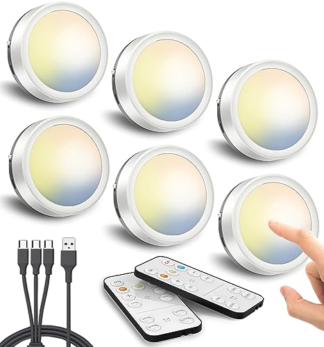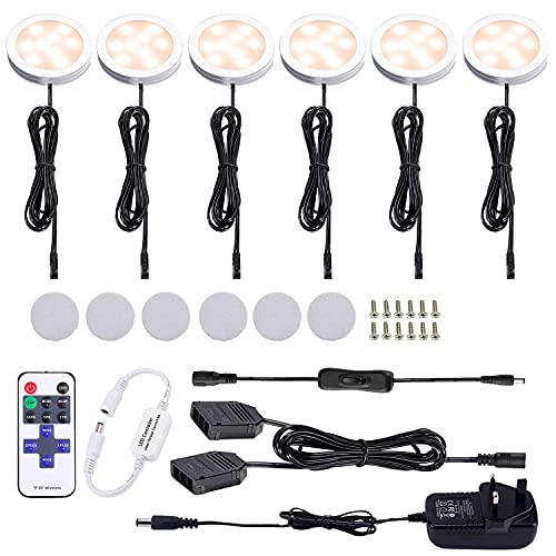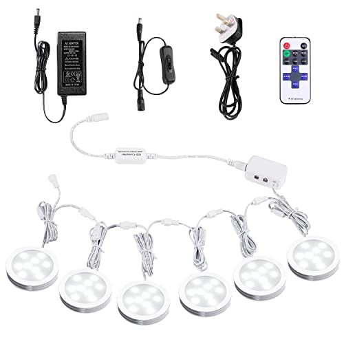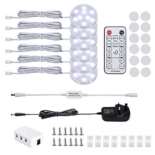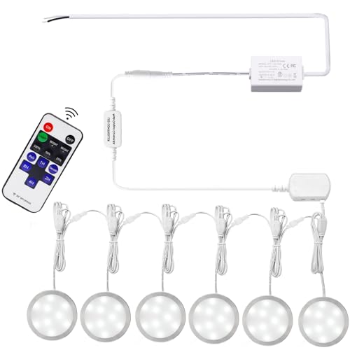 LABOREDUCER Under Cabinet Light Kitchen Kit,Dimmable Display Cabinet Lighting Cupboard Lights with Remote Control,6 Pack Puck Lights Under Cabinet Kitchen Lighting for Closet,Counter,Shelf,Wardrobe