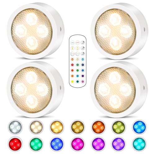 Onumii Puck Lights with Remote & Timer, Under Cabinet Kitchen LED Lights - RGB Coloured Display, 4 Pack - White