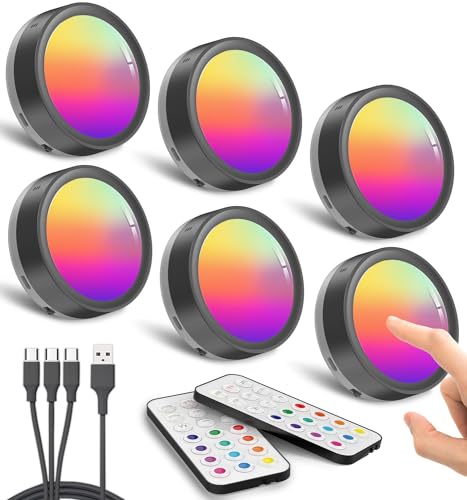 Rechargeable RGB Puck Lights with Remote Control, 1600mAh Battery Stick On Lights for Under Cupboard Touch Light LED Coloured Kitchen Cabinet Lights Magnetic USB Spot Light for Display Shelf Bookcase