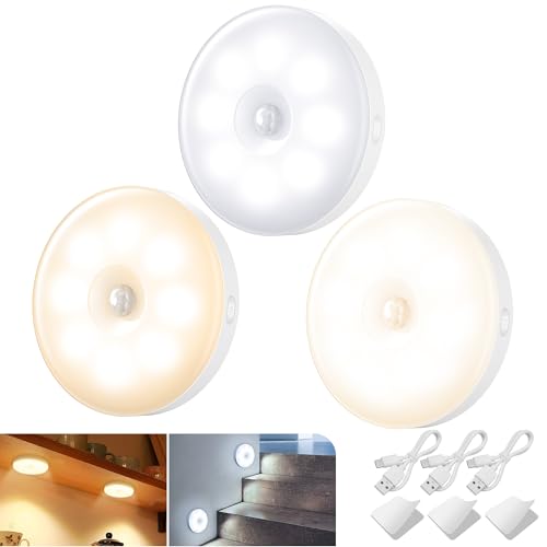 EvaStary 3 Colors Dimmable 600mAh Motion Sensor Under Cabinet Lights, Indoor USB Powered Wall Lights, Stick on Wireless Puck Lights for Hallway, Stairway, Basement, Kitchen, 3Pack