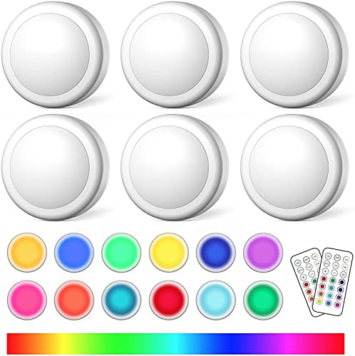 Moman 6 Pack Under Cabinet Lights, 13 Changing Colors LED Puck Lights with Remote Control, Dimmable Battery Operated Timer Stick on Light for Under Cupboard, Wardrobe, Party, Kitchen (T025 White)