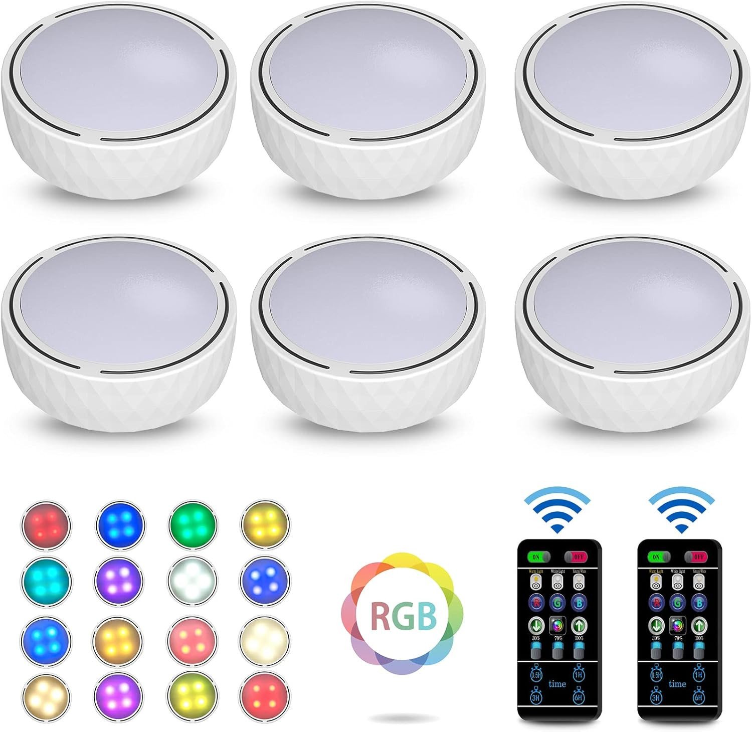 WUYOR Wireless Under Cabinet Lights, 16 Color LED Puck Lights with Remote Control, RGB Brightness Adjustable, 6 Packs Black