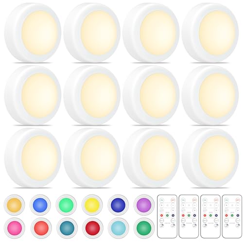 WUYOR Wireless Under Cabinet Lights, 16 Color LED Puck Lights with Remote Control, RGB Brightness Adjustable, 12 Packs