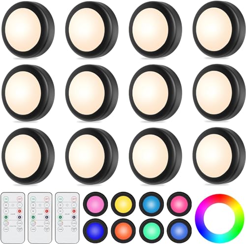 WUYOR Wireless Under Cabinet Lights, 16 Color LED Puck Lights with Remote Control, RGB Brightness Adjustable, 12 Packs Black