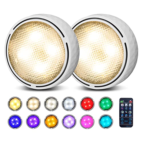 Yzzthumss Under Cabinet LED RGB Dimmable Puck Lights with Remote Control Wireless Hill Sensing Spotlights for Wine Racks 2PCS
