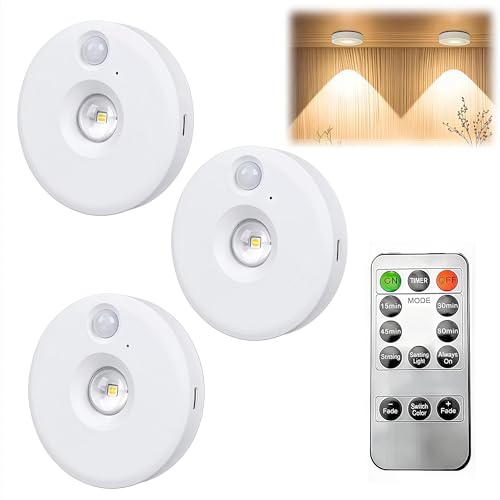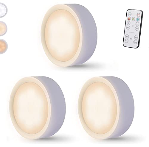 Helcona Wireless Under Cabinet Lighting,LED Puck Lights with Remote Control,3 Color Dimmable Timing Function Push Lights Ideal for Kitchen Cabinets, Bedrooms, Closets, Garage and More 3 Pack