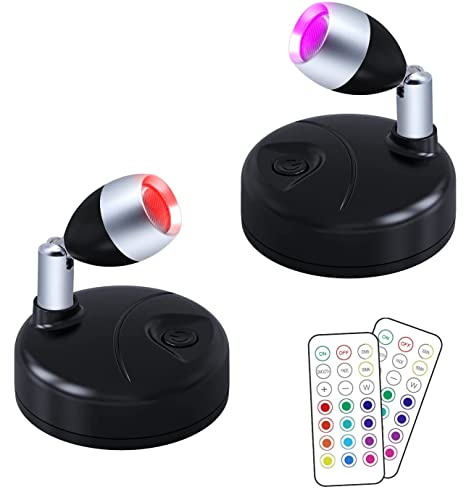 Helcona Wireless LED Spotlight w/ Remote Control, RGB Battery Spot Lights Indoor Art Lights Color Changing Mini Picture Light Dimmer Puck Lights Timer Wall LightHallway Cupboards 2 Pack, Black (DR-1)