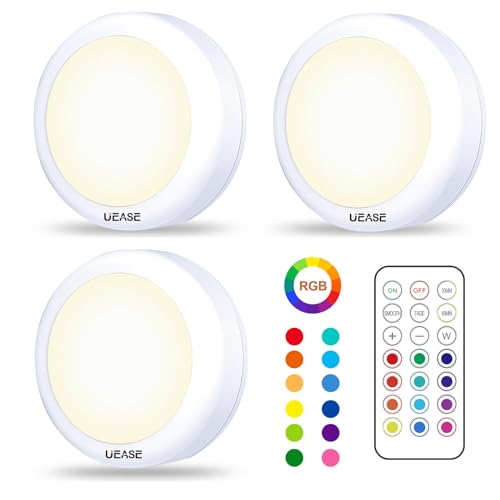 UEASE Under Cabinet LED Lights with Romote, 3PCS RGB Light Wireless Lights Battery Powered Puck Lights Under Cupboard Tap&Remote Control, 13 Colors, Dimmable, Timer, for Kitchen Bedroom