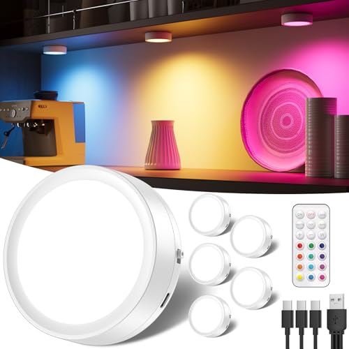 WILLED Under Cupboard Kitchen Lights Rechargeable, RGB Under Cabinet Light with Remote Control, Timing Function, Wireless LED Puck Lights for Kitchen Cupboard, Cabinet and Showcase(6 Pack)