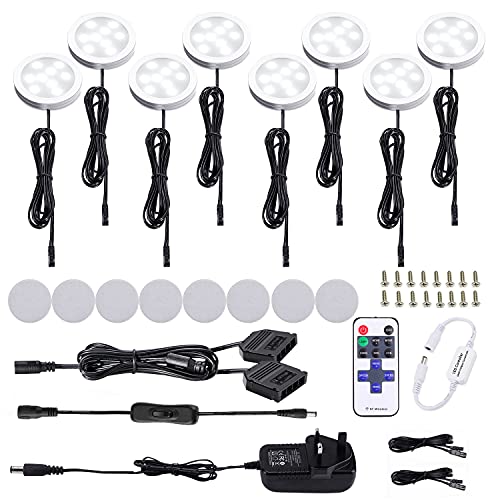 AIBOO LED Under Cabinet Kitchen Lights 8 Pack Dimmable with Remote,240V LED Puck Lights Plug in Under Counter Lights for Kitchen,Cabinet,Cupboard,Display Shelf,Bookcase,Daylight White 6000K