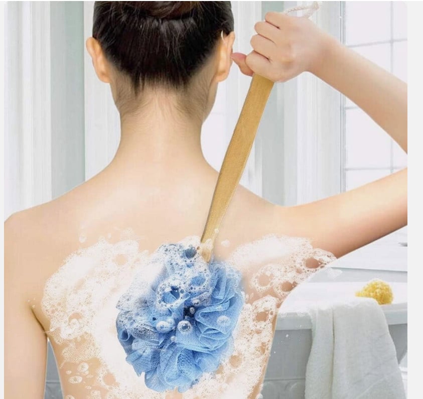 Exfoliating Body Puff Shower Bath Sponge Ball Wooden Handle Back Body Brush Blue