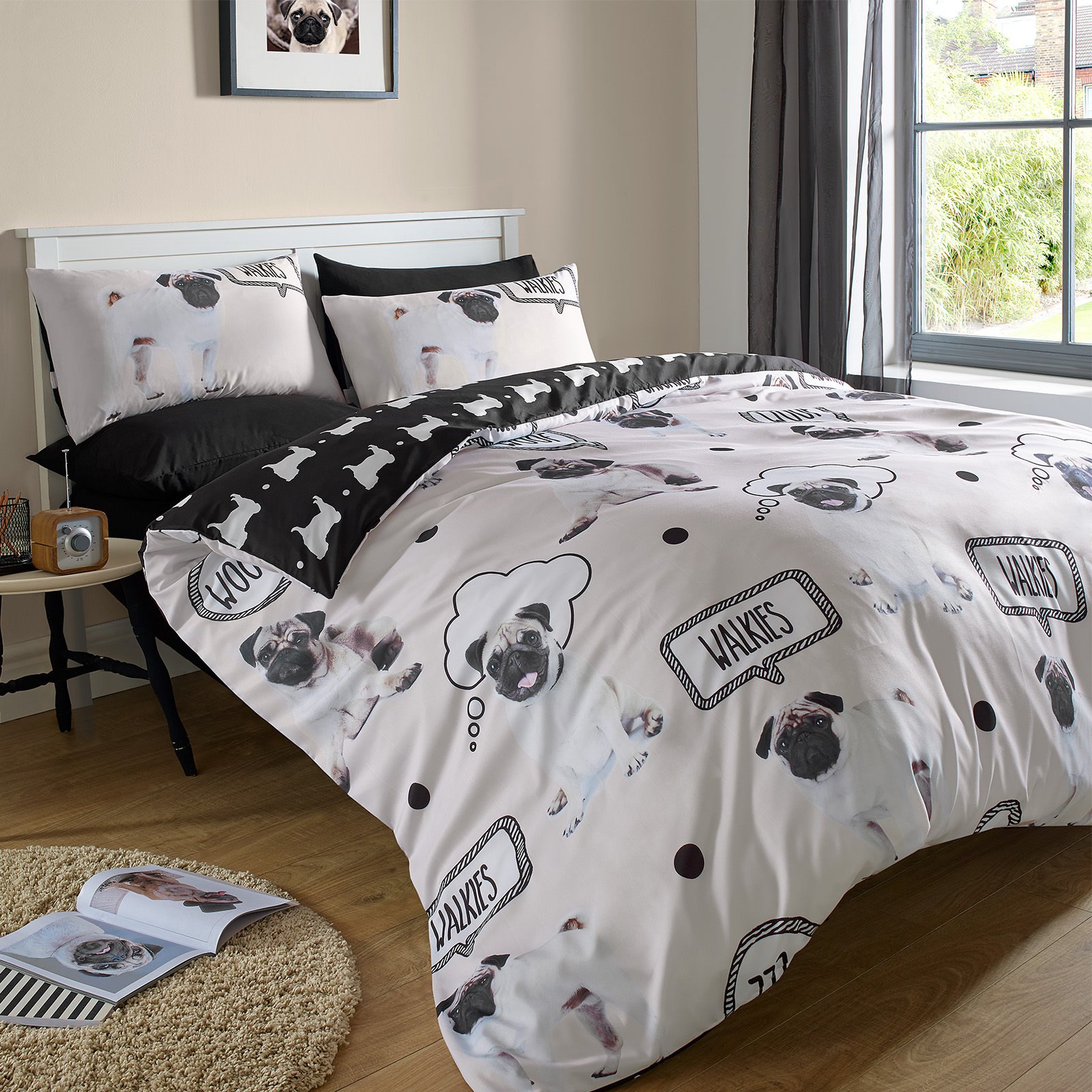 Duvet Cover with Pillowcase Bedding Set Walkies Pug Dog Cream - King