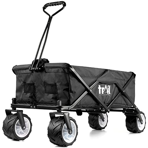 Trail Beach Trolley Cart Folding Camping Festival Wagon With Pull Along Handle, All Terrain Wheels, Drink Pockets, 60KG Capacity (Black)