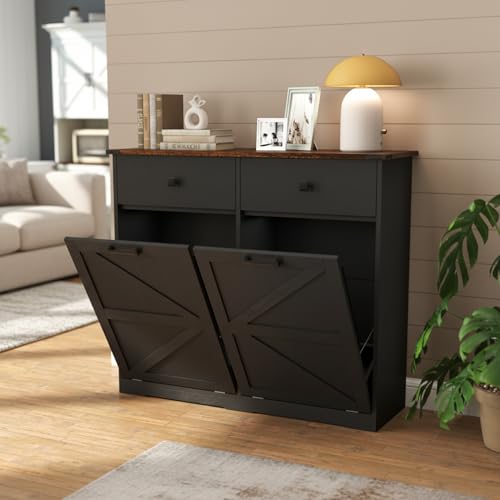 FEBORY Farmhouse Dual Tilt Out Trash Can Cabinet, Holds 2 x 10 Gallon Bins Hidden Laundry Hamper Cabinet, with Hideaway Drawer Garbage Can Cabinet, Ideal for Kitchen & Laundry Room (Black)