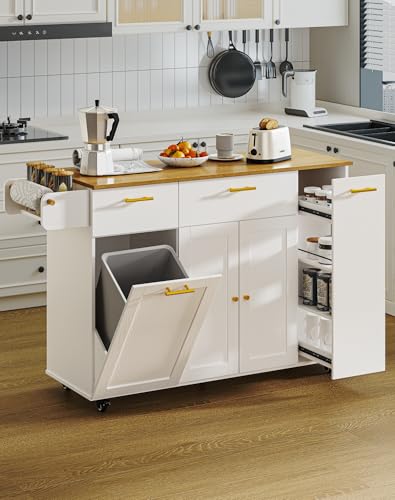 XJBTBA 55" Kitchen Island with Storage, Island Table for Kitchen with Drawers, Flip-Top Trash Can and Pull-Out Cabinet, Side Tissue Holder and Hooks, Rolling Carts with 5 Wheels for Dining, White