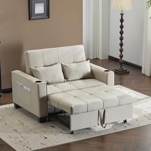 Wiuzo 2 Seater Sofa Bed with Cup Holders, Pull Out Sleeper Sofa Convertible Fabric Sofa Chair Foldable Bed Settee for Living Room/Apartment/Small Space (Beige)