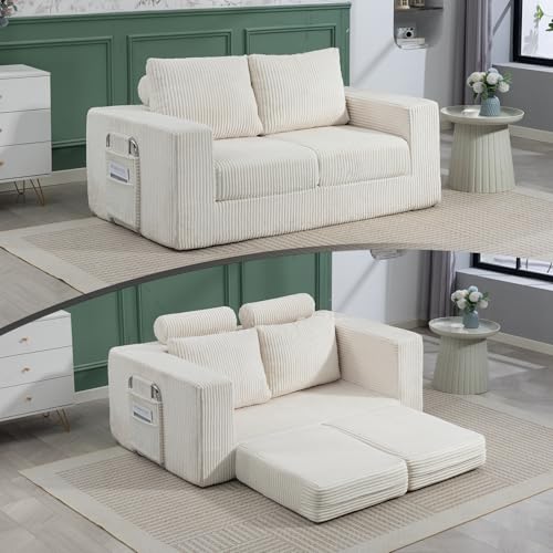 Pull Out Couch Convertible Sleeper Sofa Chair Corduroy Fabric, Washable Cover Sturdy Metal Legs Sofa Sleeper Couch for Small Spaces & Guest Rooms(White,85cm)