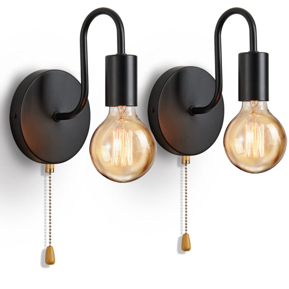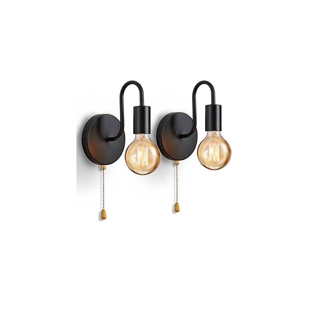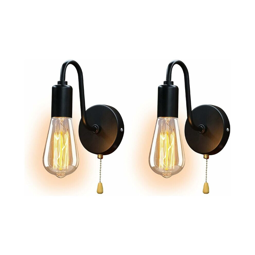 Lightess 2Pcs Wall Light with Switch Pull Cord Wall Lights E27 Socket, Retro Metal Iron Wall Sconces Industrial Wall Lamp for Bedroom Living Room Hallway (No Bulb, Black)