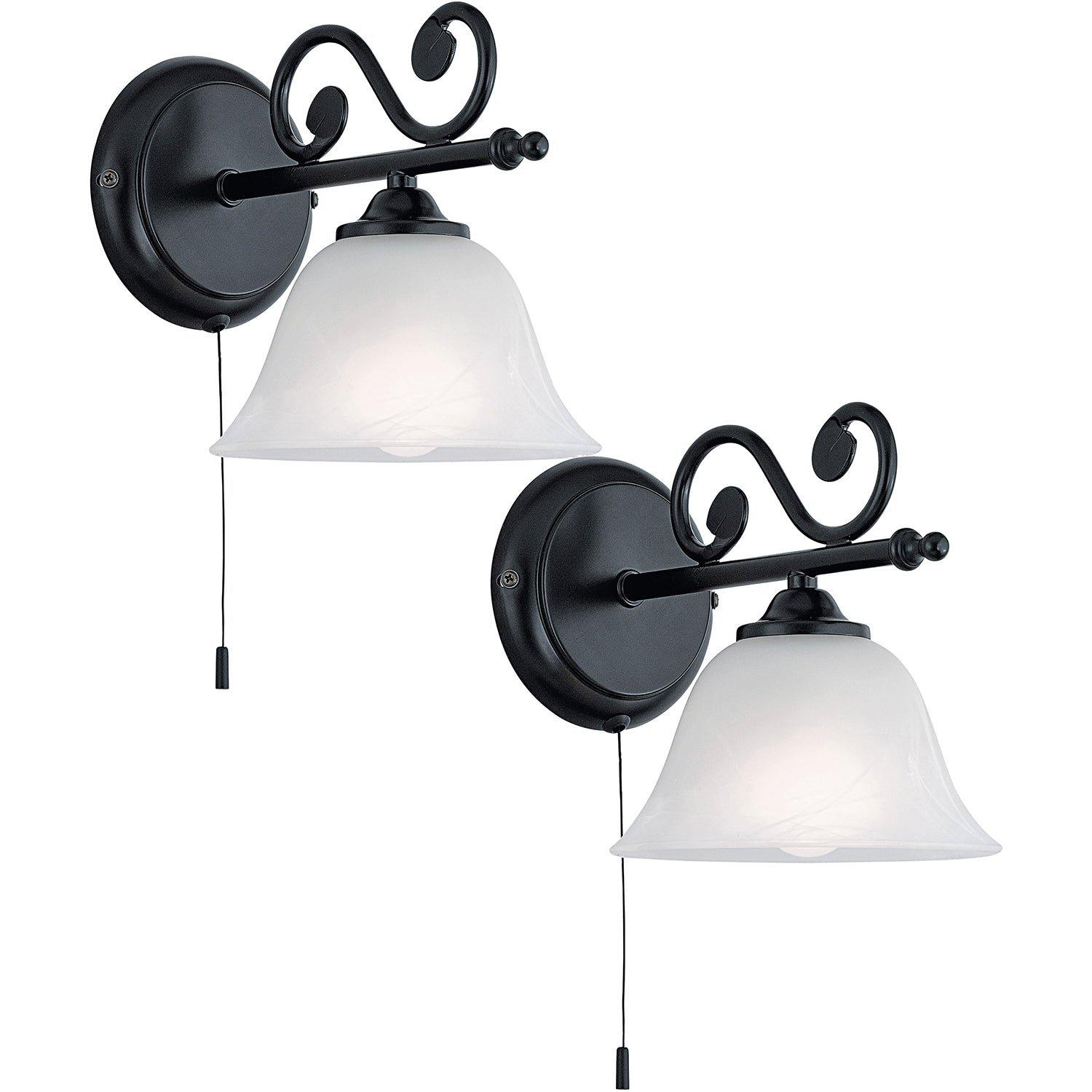 2 PACK Wall Light Black Steel Shade White Glass Alabaster Pull Switch E14 1x 40W