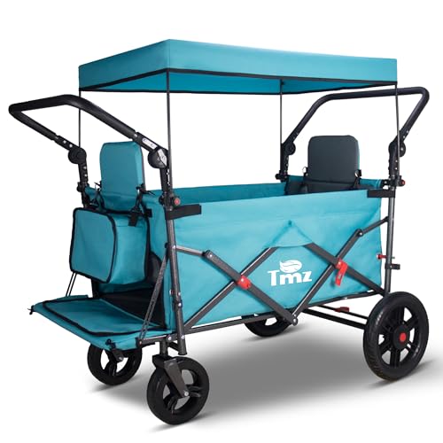 TMZ Folding Trolley Portable Push Pull Cart Wagon with Adjustable Handle Bar Handcart With 2 Seats and Canopy Transport Wagon for Beach Garden Camping 265LBS Capacity (Turquoise/Grey)