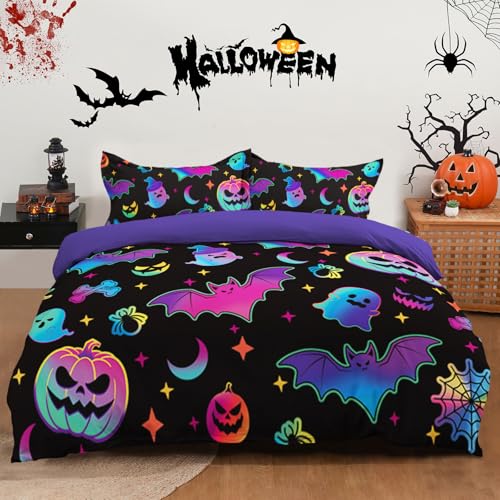 Fondream Halloween Bedding Set Single Size, 2 Pieces Duvet Cover Set with 1 Pillowcase, Bat Pumpkin Spider Purple Bedding Set Holiday Decor Reversible(Single, 2Pcs)