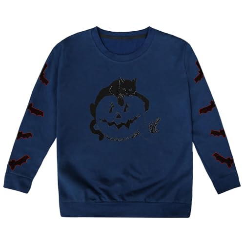 Jumper for Girls 11-12 - Halloween Sweatshirts Cat Pumpkin Printed Long Sleeve Crewneck Pullover Tops Loose Fit Funny Holiday Sweatshirt (Navy 13-14Ears)