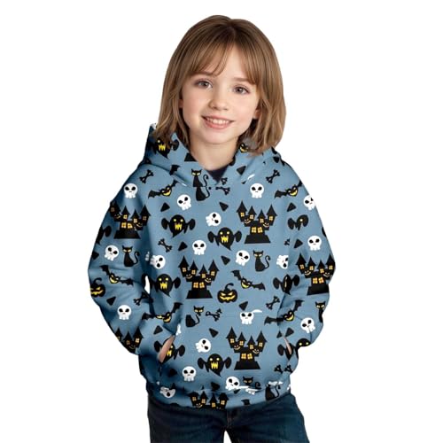 Girls Halloween Hoodie Kids Skeleton Pumpkin Print Sweatshirt Teen Girls Long Sleeve School Hooded Jumper Loose Fit Pullover Top with Pockets Fall Winte Sportswear Clothes Age 1-14 (Blue, 7-8 Years)