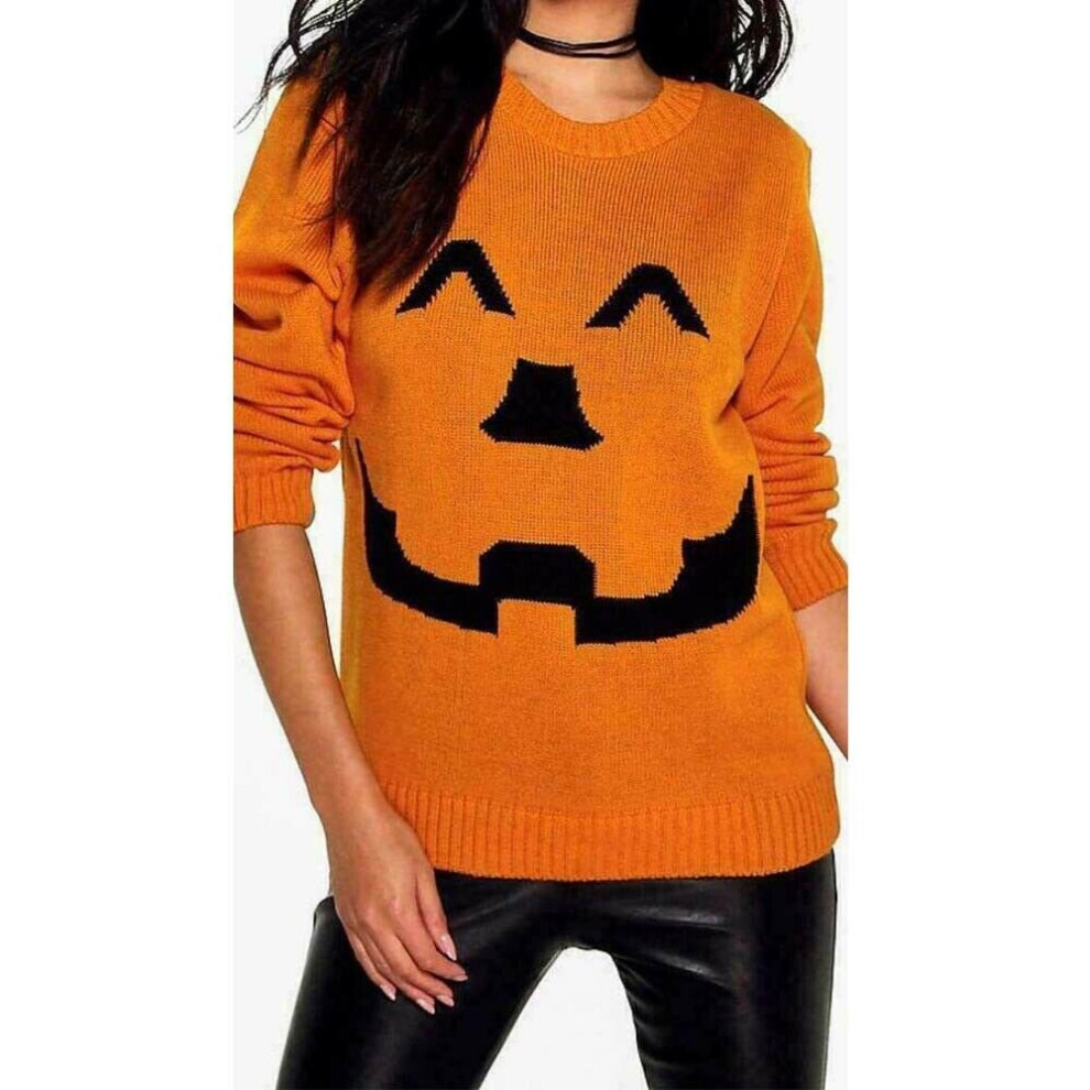 (Orange, ML UK 12-14) New Ladies Women's Halloween Pumpkin Face Knitted Jumper Dress Sweater Top 8-22