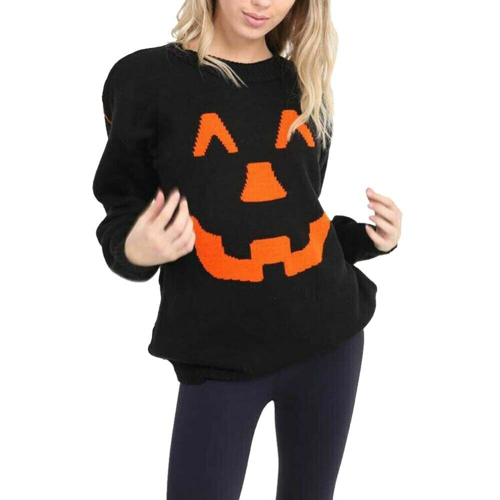 (Black, ML UK 12-14) New Ladies Women's Halloween Pumpkin Face Knitted Jumper Dress Sweater Top 8-22