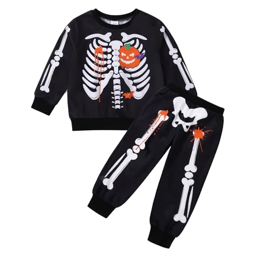 Naiyafly Toddler Kids Skeleton Halloween Outfit Boys Girls Skull Pumpkin Print Long Sleeve Pullover Sweatshirt Jumper + Jogger Pants 2Pcs Fall Clothes Set Tracksuit Pajamas 1-7 Years