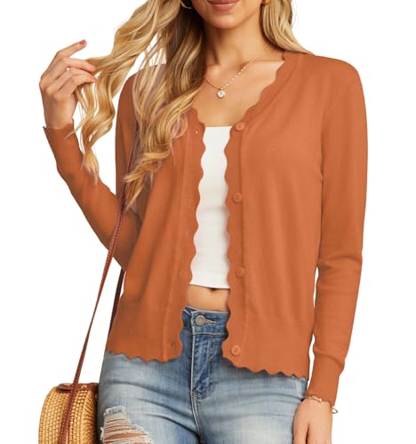 GRECERELLE Women's Cardigans Knit Long Sleeve V Neck Button Down Lightweight Ladies Scalloped Shrugs Jumper Cardigan for Dress Summer Evening Wedding (Pumpkin Orange, M)