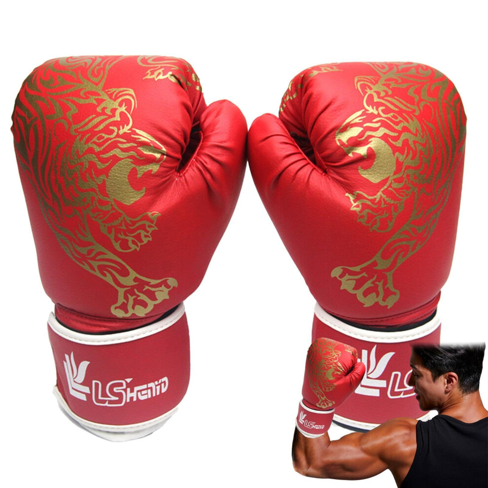 Boxing Training Gloves for Adults, PU Leather Punch Bag Gloves with Tiger Print, Children's Muay Thai Fight Gloves in Red