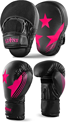 Lions Boxing Gloves and Pads - Hook & Jab Mitts Sparring Gloves Set Mma Punch Bag Training Kit (Max-Star Pink, 10oz)