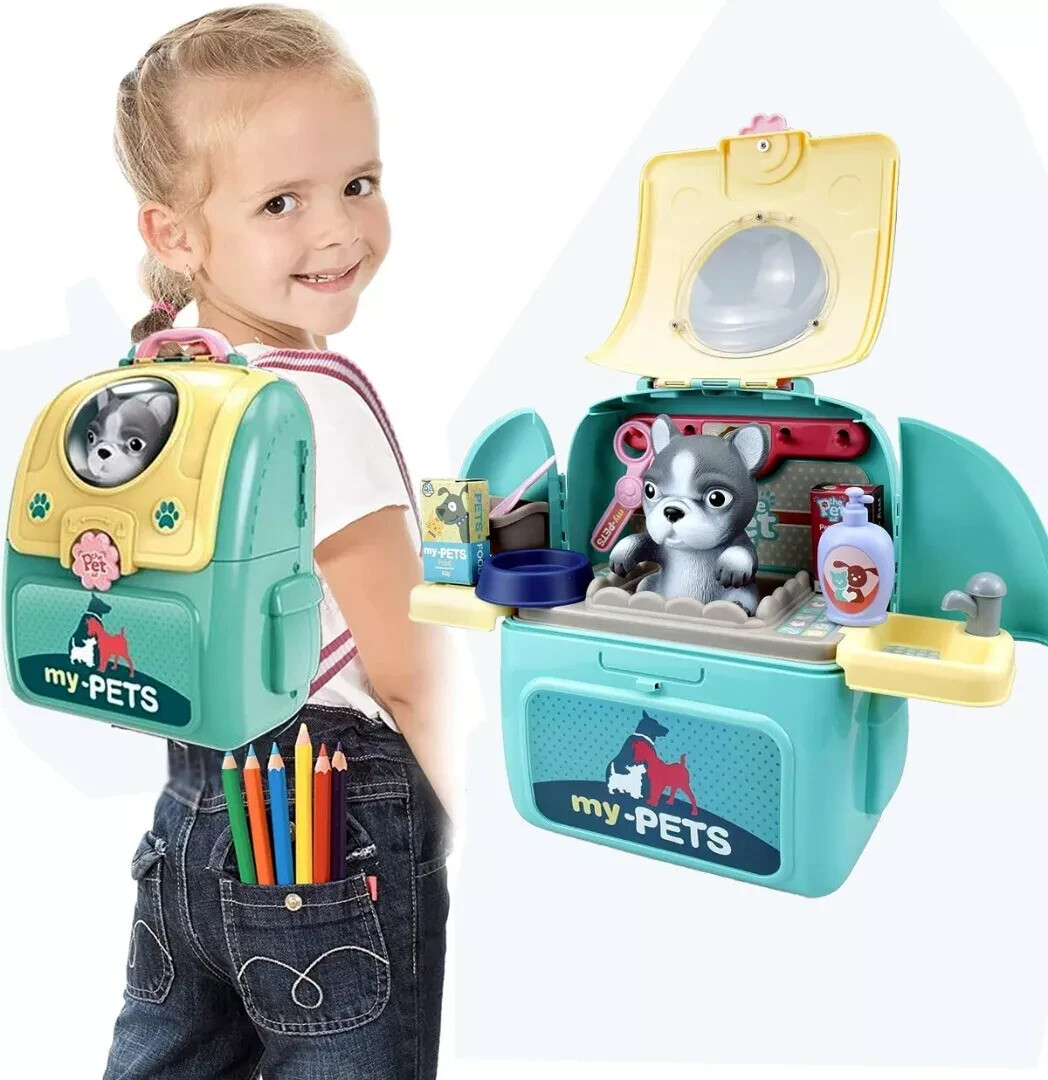 Kids Pet Care Backpack Role Puppy Play Set Grooming Pet Vet Care Playset
