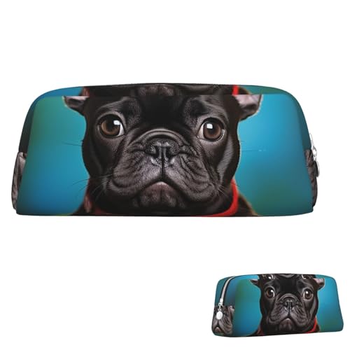peiyeety Leather Pencil Case Large Capacity Pencil Pouch Aesthetic Pen Pouch Organizer with Zipper Portable Big French Bulldog Puppy with Camera Pen Bag for Women Men
