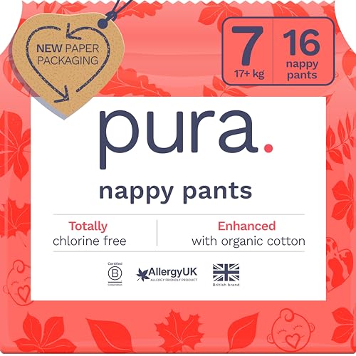 Pura Eco Nappy Pants - Size 7 (17kg+), 16 Nappies, Pull Up Disposable Baby Nappies for Sensitive & Allergy Prone Skin, Hypoallergenic, Fragrance Free, Easy-Tear Side, New Size Guide