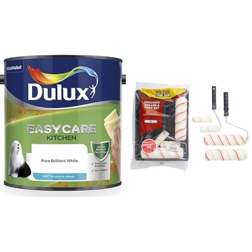 AKZO NOBEL (DIY DULUX), Pure Brilliant White, 2.5 L (Pack of 1) & Fit For The Job 7 piece Emulsion Paint Roller Set, 2x 9 inch & 2x Mini Paint Rollers, Frames & Paint
