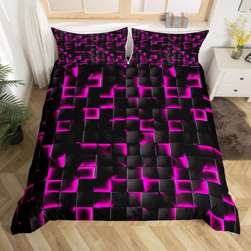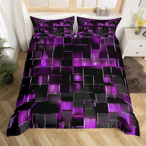 Homewish Black and Purple Duvet Cover Modern Geometric Comforter Cover Gradient Neon Cubes Double Size Bedding Sets for Girls,Abstract Square Plaid Bed Set Lattice Wall Brick Decor