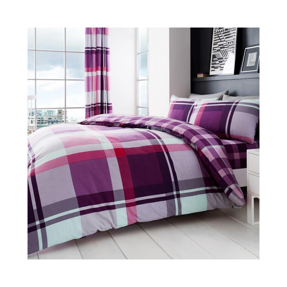 (Waverly Purple, Single) Check Duvet Cover Set Reversible Bedding Soft & Cosy Poly Cotton Printed Single Double King Size