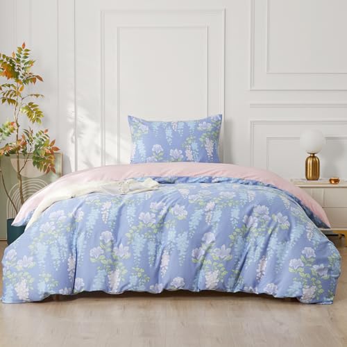SAPHREAS Purple Duvet Cover Set 100% Cotton Single Size 2 Pieces Bedding Comforter Wisteria Pattern Duvet Cover Set 1 Duvet Cover 1 Pillow Sham(No Comforter)