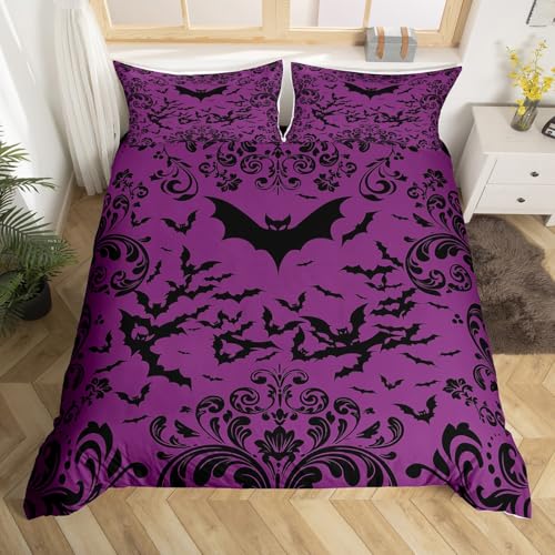 Homewish Halloween Bat Single Bedding Sets for Girls Women,Purple Black Bats Duvet Cover Gothic Damask Flowers Comforter Cover Goth Floral Animal Bed Set Halloween Room Decor Zipper 2 Pcs