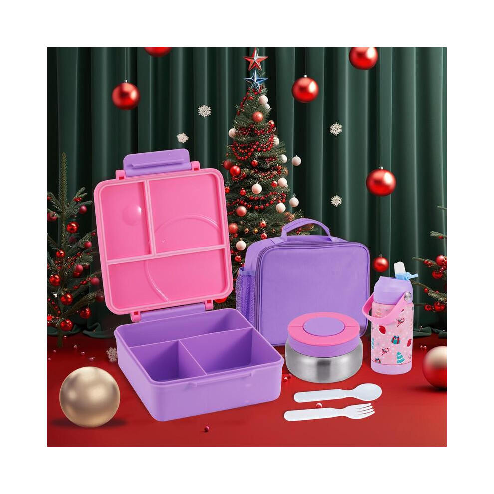 (Purple Christmas Pattern, 1 set) 4-compartment Bento Lunch Box with Soup Cup,Microwave Safe Plastic Bento Container,Lunch Accessories,Portable Food S
